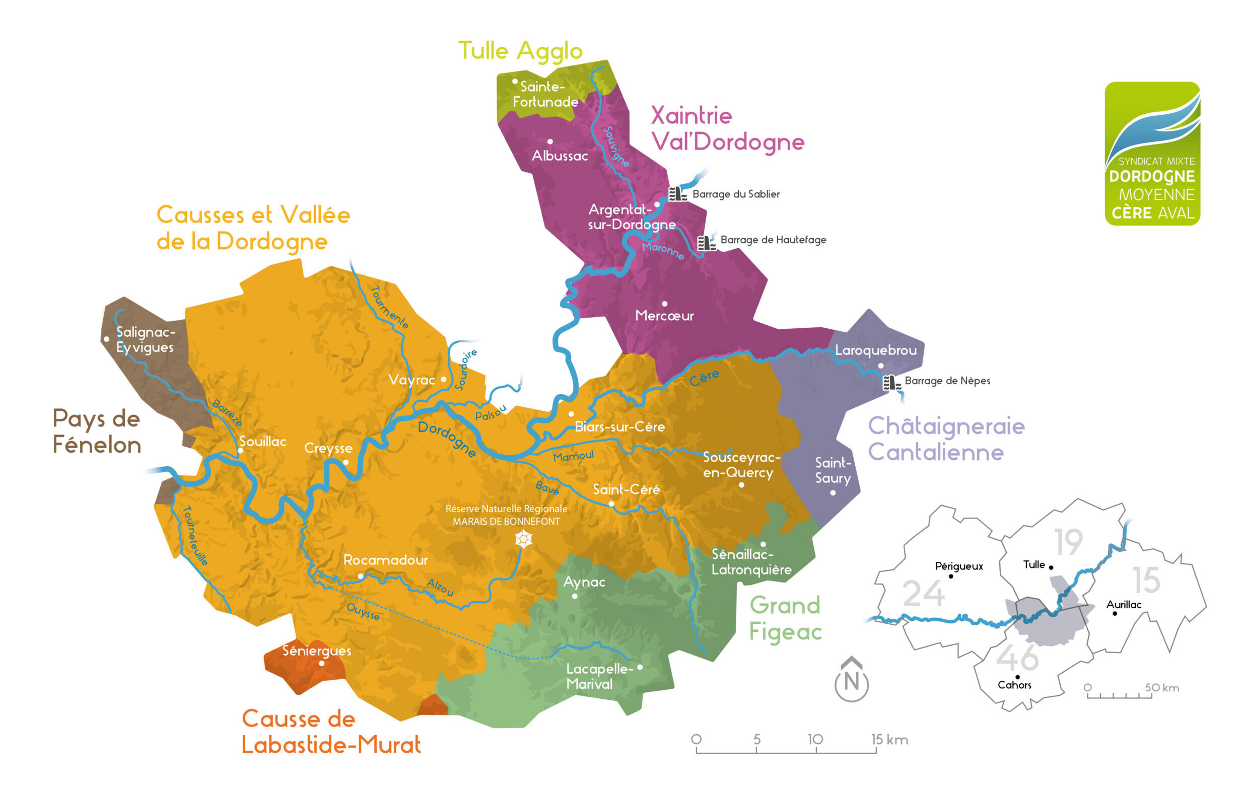 7 intercommunalités adhèrent au syndicat : les communautés de communes Causses et Vallée de la Dordogne, Xaintrie Val’Dordogne, Grand Figeac, Châtaigneraie cantalienne, Pays de Fénelon et Causse de Labastide Murat et la communauté d’agglomération Tulle Agglo.